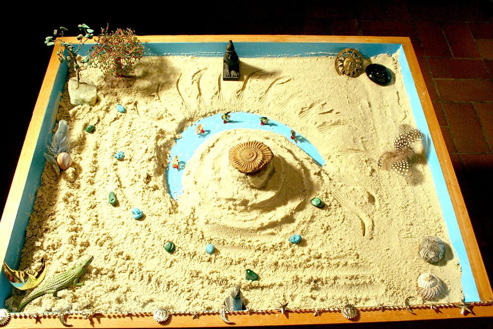 Das Therapeutische Sandspiel geht auf Dora M. Kalff (1904 – 1990) zurück, die diese Methode u.a. auf der Grundlage der Analytischen Psychologie C.G. Jungs begründete. Man gestaltet im trockenen oder feuchten Sand mit Figuren in einem übersichtlichen Sandkasten dreidimensionale Bilder. Der Aufbau geschieht spontan und ohne Vorgaben der Therapeutin oder des Therapeuten. Der Symbolgehalt der verwendeten Figuren und die Konstellationen zueinander offenbaren spannende und lebendige Geschichten des Lebens und tragen zur Erkenntnis von unbewussten Zusammenhängen bei. Das therapeutische Geschehen lebt durch das Gewähren-Lassen und Auftauchen-Lassen der Bewusstseinsinhalte. Die Ergebnisse faszinieren durch ihre vielschichten Aussagen und das große schöpferische Element. Das Entstandene verweist auf tiefere Schichten der Psyche und im Gestaltungsprozess können innere Spannungen gelöst und letztlich Energien für einen ganzheitlichen Heilungs- oder Entwicklungsprozess frei werden. Fantasie und Kreativität werden im Handeln erlebt und wirken positiv anregend auf die Psyche zurück.